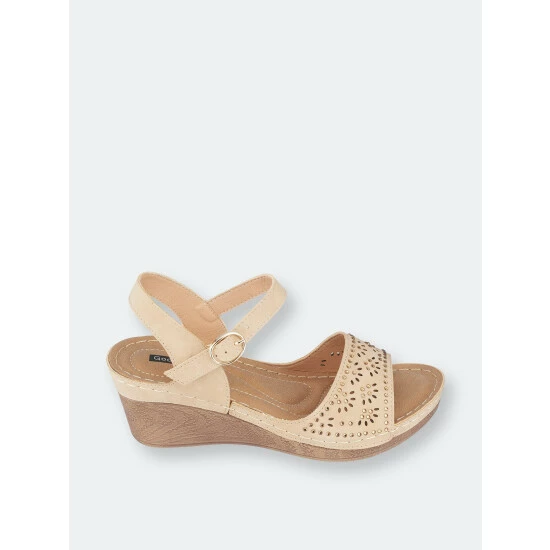 The Helen wedge sandal by GC Shoes is sure to become a warm weather favorite. This 2-piece sandal features a beautifully embellished front strap and is equipped with a cushioning footbed for all-day comfort.